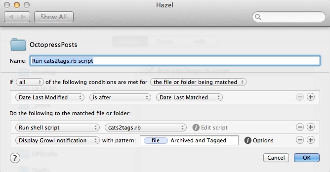 But having to fire up the terminal and run this script every time I make a new post wouldn’t very nerd-like, would it? I have another Hazel rule that looks at the Archive folder and runs the script when a new markdown file appears.