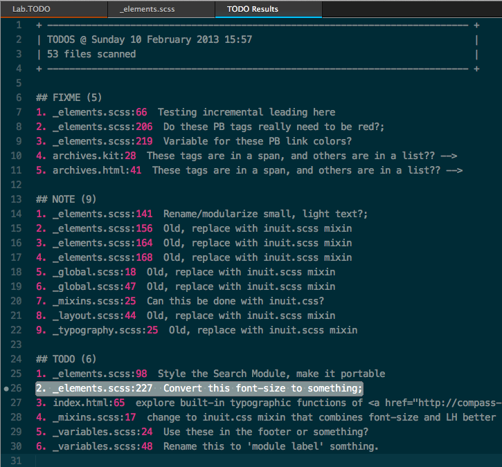 The plug-in will find every instance of TODO, NOTE, FIXME, and CHANGED across all the applicable files. The comment patterns can be customized in your user settings file, or on a per-project basis. The killer aspect of this plugin is you can navigate the list with the n or p keys and when the desired item is highlighted, press return. The file will open at the specific comment, with the cursor at the beginning of the line. 1
