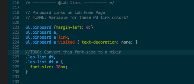 The main benefit I get out of using this is I have a lab.TODO file that lives in the root in my redesign folder and I open it first to see what needs to get accomplished. Invariably when I’m working on one aspect of the site, a related task or idea arises that I need to capture quickly. Rather than switching to completely different app, my task list is just a tab away (⌥ ⌘ left/right arrow to cycle through open tabs). Significant friction reduction, as the productivity dorks say.
