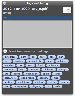 Leap also has a nifty tray that slides out from the side of the screen when you drag any file. Drop the file on it and a tag window with a list of recently used tags appears: